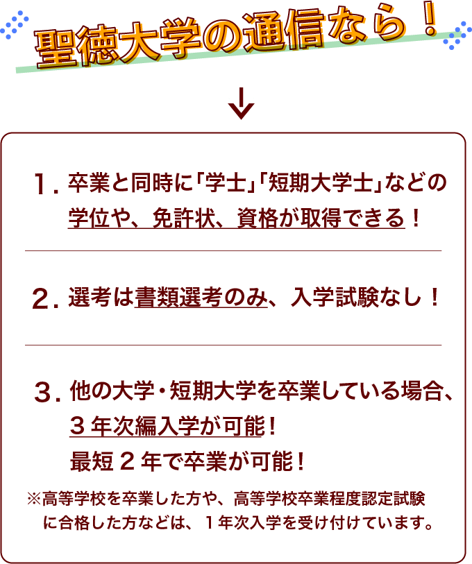 最初は近所の専門学校を考えていました。子どもがまだ小さく、家族との時間も大切にしたいと思いインターネットで見つけた通信制の聖徳に決めました。説明会に参加し、先生方に親身になって相談いただけたことも決め手でした。