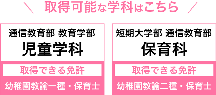 大学児童学科では3年次編入学で幼稚園一種免許と保育士資格が最短2年で。また短大保育科では、幼稚園二種免許と保育士資格が3年間で目指せます。