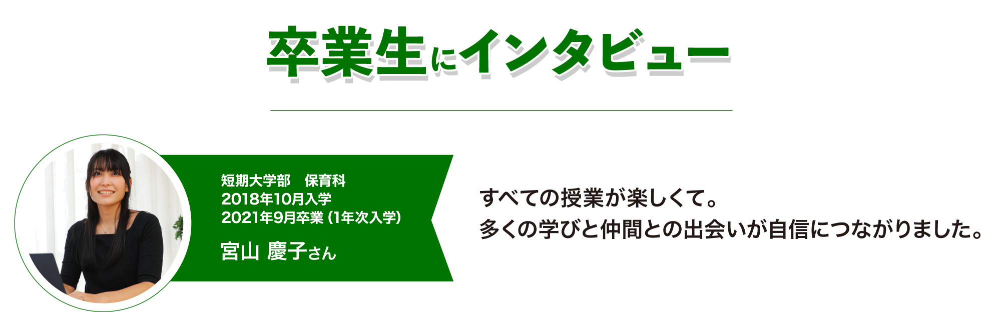 聖徳で幼稚園教諭二種免許状と保育士の資格を取得。現在、認可保育園で保育補助として働いていますが、100歳まで大好きな保育の仕事に就けるように、もっともっと勉強していきたいです。