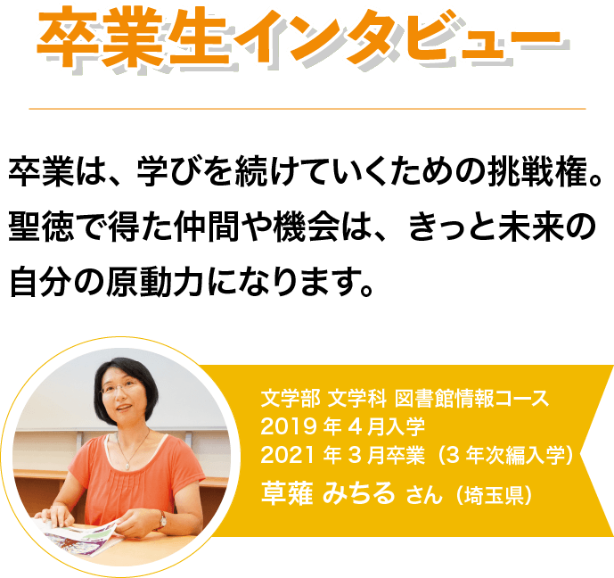 図書館が好きだったので、司書の勉強をしてみようと思い立ち、距離的に一番近かった聖徳大学を選びました。スクーリングや試験以外の自習にも大学の施設を多く利用できてよかったです。